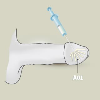 Die erste Methode, nämlich die Injektion einer bestimmten herkömmlichen medizinischen Substanz, wird durch die gezielte Einführung der Substanz über eine sehr dünne Nadel in die Eichel unter lokaler Narkose durchgeführt.